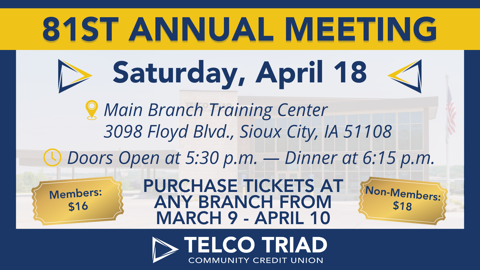 Join us for an evening of connection, celebration and community at Telco Triad Community Credit Union’s 81st Annual Meeting. We look forward to welcoming members and guests for dinner, updates and a chance to come together as a Credit Union family.